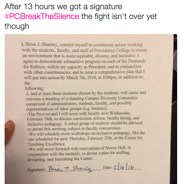 Walsh said in a statement "Shanley came in at 4:26 and refused to sign the agreement. It was the first time he read the agreement with his own eyes. He refused despite the fact that over 40 students have waited in his office for eight hours now and three students, including myself, continue to hunger strike. He said there is nothing he can do in terms of making all of our demands happen. He said, as he always does, that action is being taken to combat racism on campus yet will not show exactly what that action is."