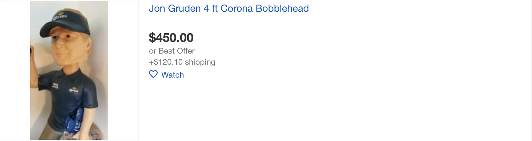 While some might think a giant (4 foot tall) Jon Gruden Corona Bobblehead is priceless, GoLocal found one up for sale on E-Bay. The price? $450.00.