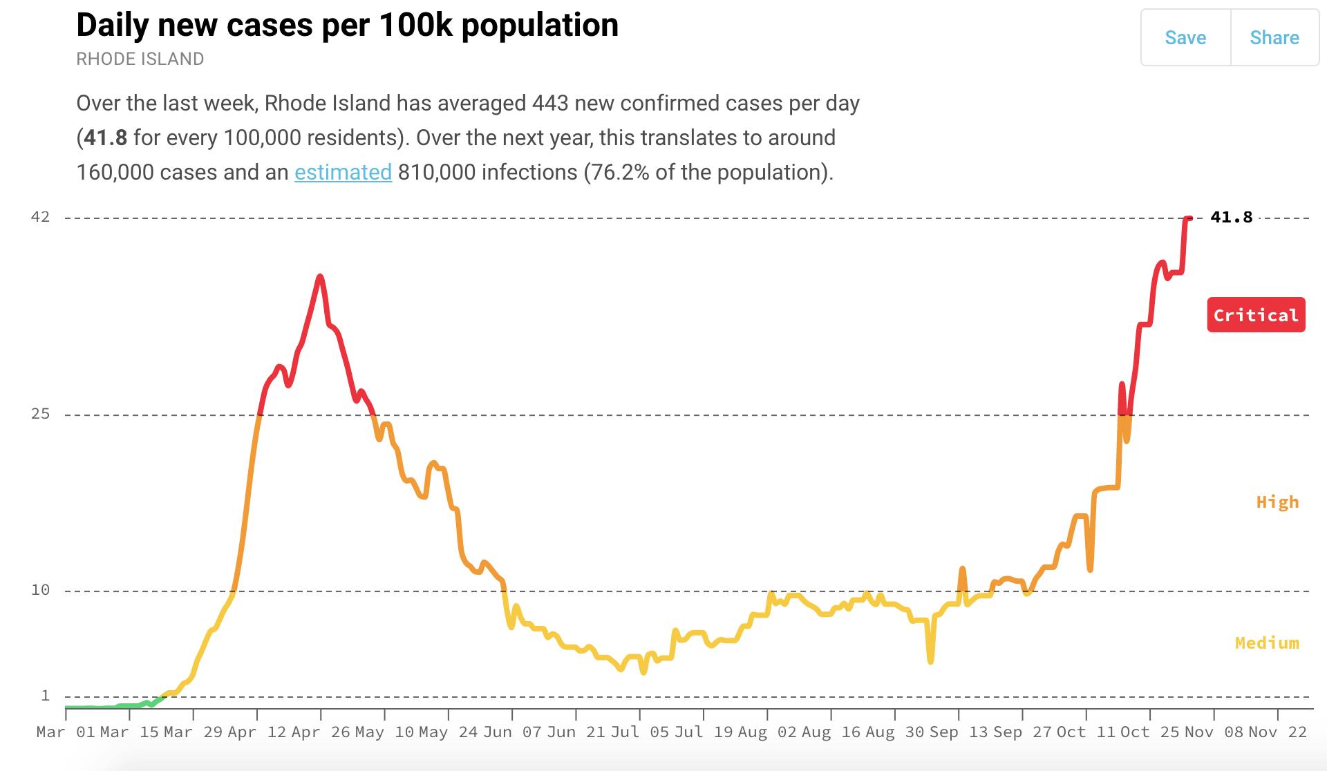 Covid Act Now has Rhode Island ranked as the only state on the East Coast as "Critical."