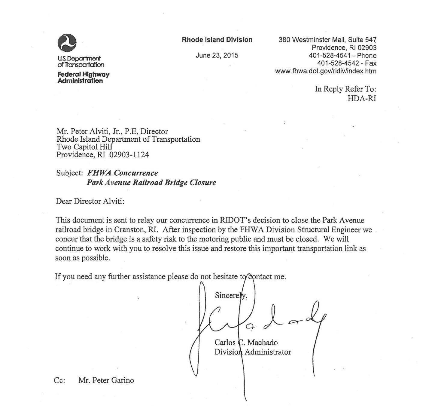 On Tuesday, RI DOT issued a press release announcing the closing of the bridge located near Mattiello’s office. SEE THE LETTER BELOW FROM US DOT