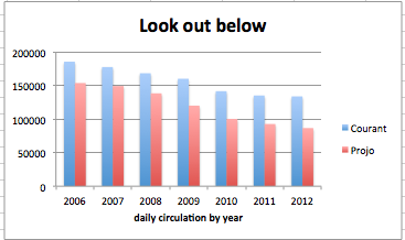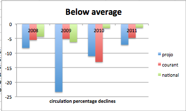 And notice that the Courant, like the Projo, has consistently has performed worse than the national average in circulation losses. That’s here: