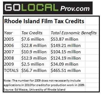 In 2010, Rhode Island made $15 million available in film tax credits. Some states spent more—like California, where as much as $100 million was available. But on a per capita basis, Rhode Island’s costs more: $14.24 per person versus $2.75 per resident in California, using 2009 U.S. Census data.