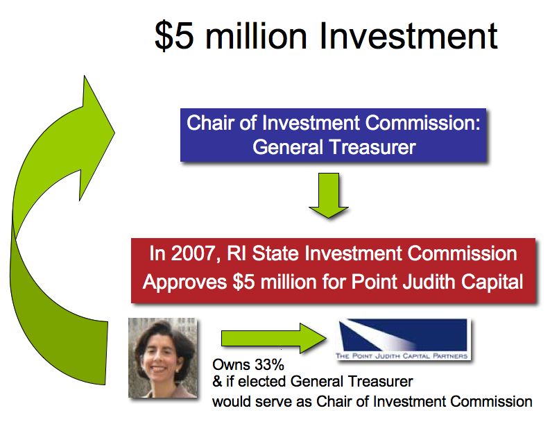 Raimondo told GoLocalProv that she would ensure there was no conflict by resigning from her firm and severing any financial ties with it—if and after she is elected. Moreover, she said if the General Treasurer had to make any decisions about its $5 million investment with Point Judith Capital Partners, she wouldn’t be involved in them.