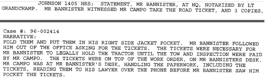 But Campo says he never did anything wrong and disputes the police report’s account of events—even though Bannister’s allegations of larceny are backed up by three witness statements, including one Interstate Diesel employee who says he observed Campo seize the customer service tickets.