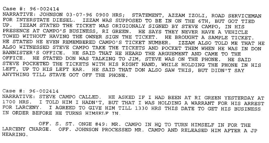 In March 1996, Campo was charged with failure to pay for work done on one of his tractors at Interstate Diesel, a local mechanic’s shop. According to a police report on the incident obtained by GoLocalProv, Campo snatched four copies of the customer service ticket from the manager’s desk and then left. Without any legal records of the work, the shop had no right to demand payment or hold onto his tractor until it received payment, the police report indicates. (See below excerpts.)