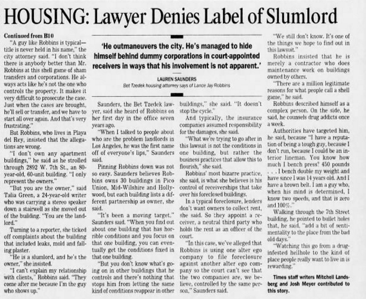 For years, Lauren Saunders battled Robbins in Los Angeles. Today, Saunders serves as Managing Attorney at National Consumer Law Center. The Harvard Law Bulletin featured Saunders' Robin Hood like efforts — and said her efforts should create a new category of law, “Slumlord Slayers.”