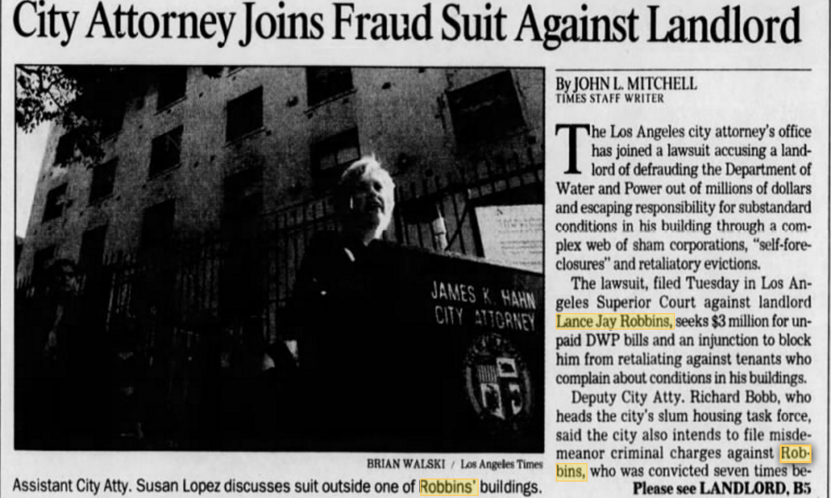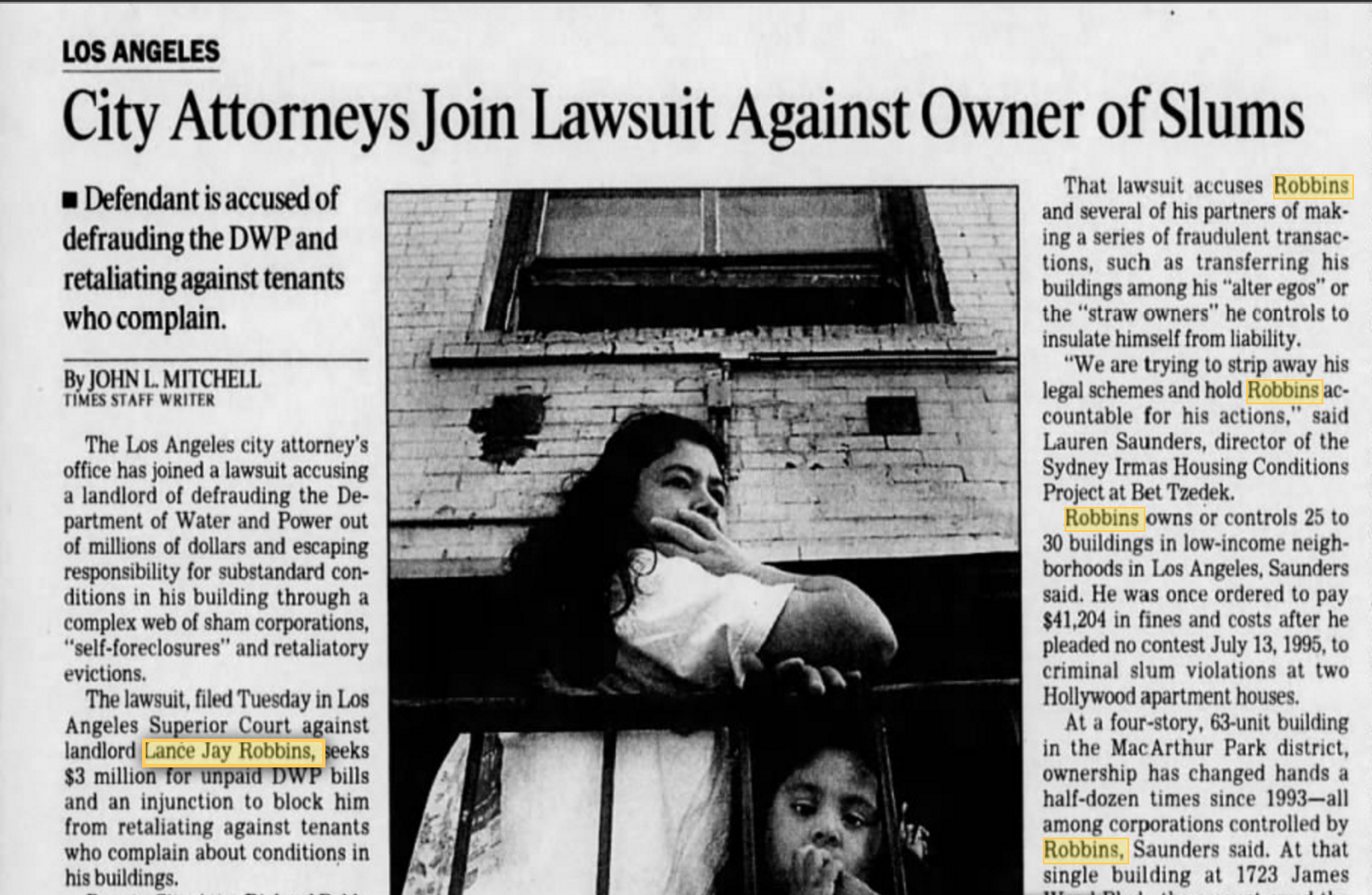 In California, from the mid-1980s to the mid-to-late 1990s, Robbins was cited with 105 health and building-code violations ranging from operating apartment buildings with blocked emergency exits to failing to maintain fire extinguishers, according to California Superior Court records.