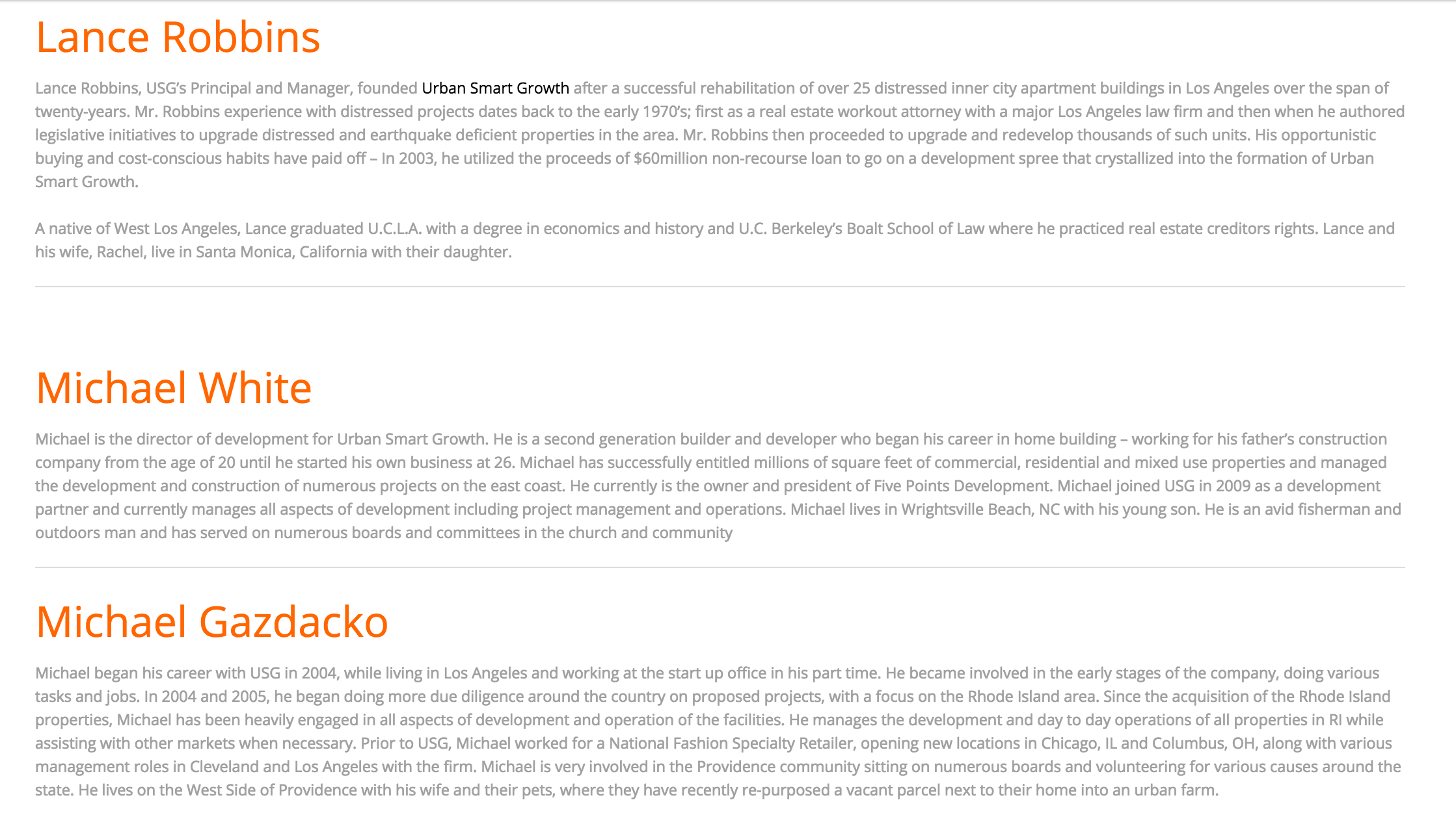 Page was deleted from website this summerAccording to documents filed with the Rhode Island Secretary of States office and other documents, Gazdacko has been tied to Robbins in a number of his business interests. The business in Rhode Island that Gazdacko and Robbins manage is called Urban Smart Growth and the management team page was removed in the past few weeks. GoLocal was able to secure an achived Internet page of the site and found that Gazadacko and Robbins constituted two of the three members of the company's management team.