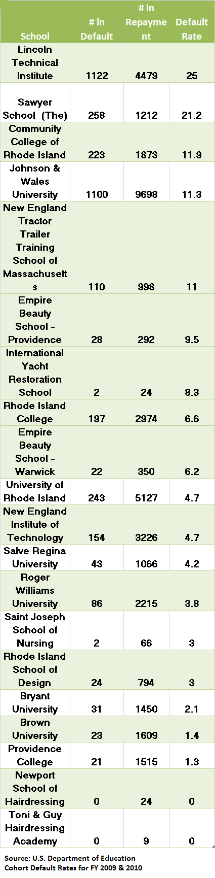 Roughly one of every ten students from Rhode Island colleges who began paying back their federal loans in fiscal years 2009 or 2010 has defaulted, according to data released last week by the U.S. Department of Education.