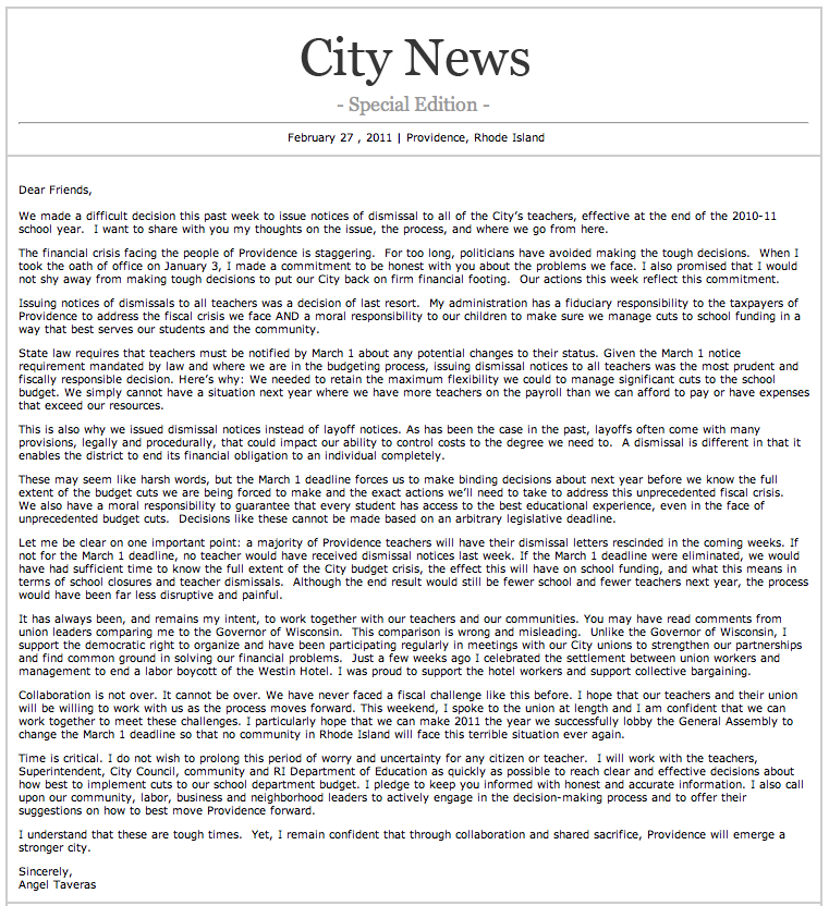 In a City News E-blast, the newly seated Mayor did not back off his decision and for the first time criticized the previous administration - Mayor David Cicilline. In the open letter-style e-mail, Taveras wrote: