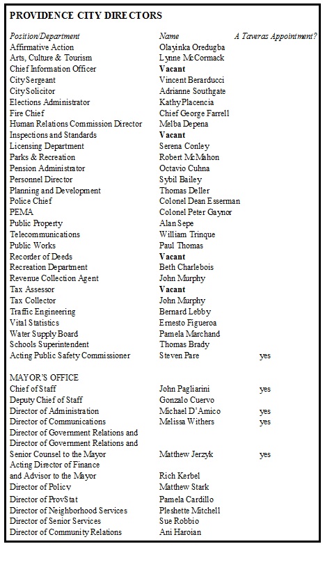 They include some of the biggest figures from the Cicilline years—Police Chief Dean Esserman, Fire Chief George Farrell, Schools Superintendent Thomas Brady, former Director of Administration Richard Kerbel, and Gonzalo Cuervo, who held many positions under Cicilline and now is Deputy Chief of Staff to Taveras. (See below for the complete list.)