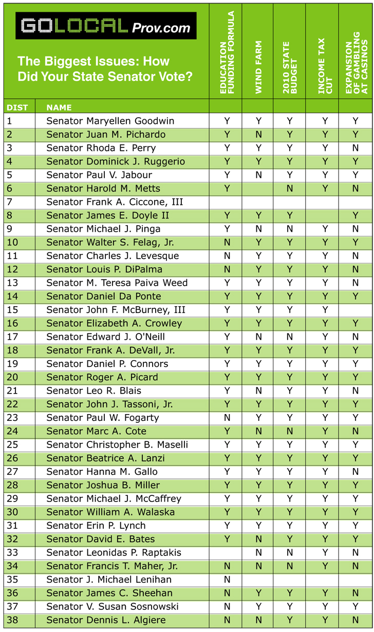 They were five of the biggest issues facing the state—and the Rhode Island Senate decided all of them in the past session. Below, find out how your state Senator came down on the issues. Click here for a description of the issues and here for a list of how state reps voted.