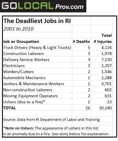 Between 2001 and 2010, the deadliest jobs in Rhode Island included light and heavy truck drivers, construction laborers, electricians, auto mechanics, and unskilled and untrained laborers, according to the data, obtained from the state Department of Labor and Training. Other jobs that resulted in higher fatality rates were maintenance workers, deliverymen, and operators of moving equipment, such as loaders and conveyors. (See below charts for complete list of the top ten.)