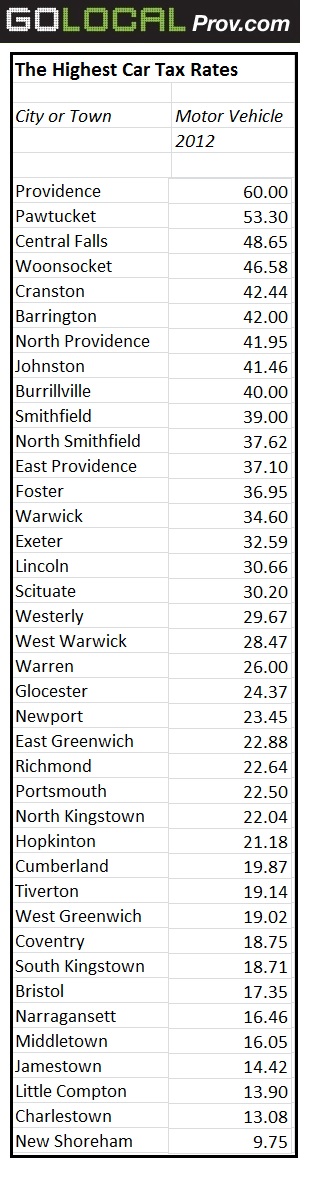 ■ Car taxes: Providence was the only community to cut its motor vehicle tax rate, yet it still tops the list with a rate of $60 per $1,000 in value. Although the rate was lowered, Providence reduced the exemption too—meaning more people will be paying the tax.