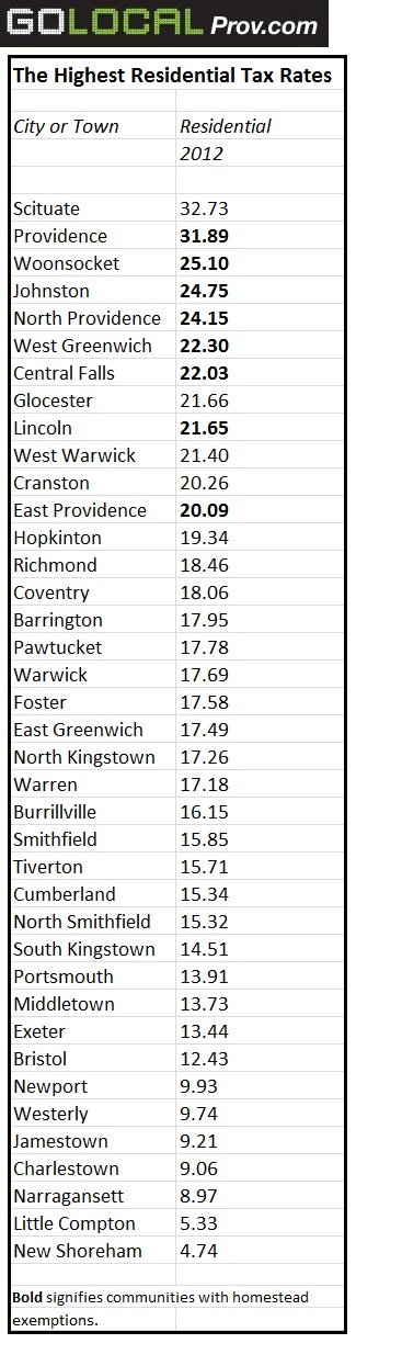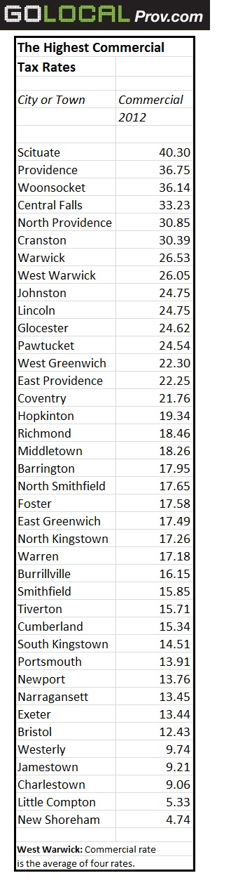 ■ High taxes in Scituate: Scituate takes the top spot in residential taxes with a rate of $32.73, beating out Providence with $31.89. In terms of commercial rates, Scituate takes the number one place as well.