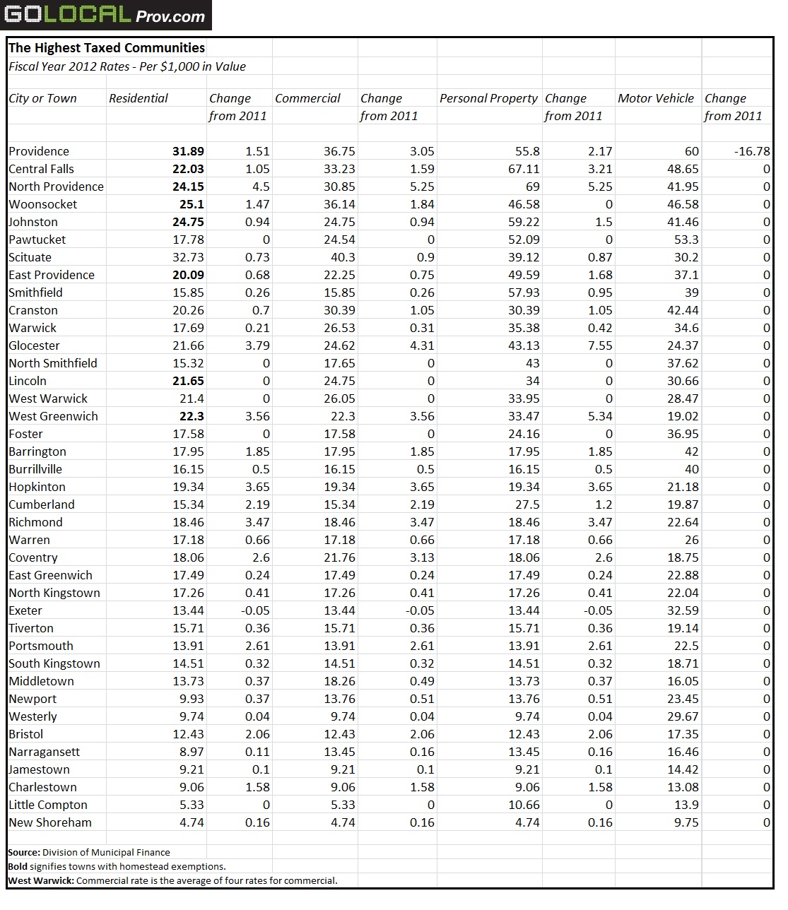 GET THE LATEST BREAKING NEWS HERE -- SIGN UP FOR GOLOCAL FREE DAILY EBLASTOf all the cities and towns in the state, only a handful saw no increase in residential or commercial rates. Just six communities stayed the same—Foster, Lincoln, Little Compton, North Smithfield, Pawtucket, West Warwick. And only one saw a slight decrease in its residential and commercial rates: Exeter. (See below charts for the complete breakdown.)