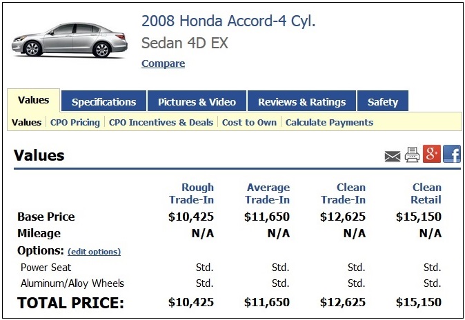For the 2008 Honda Accord, the clean retail value is listed as $15,150. The next lowest value is the clean trade-in, at $12,625. The lowest listed value is $10,425, which is the rough-trade in.