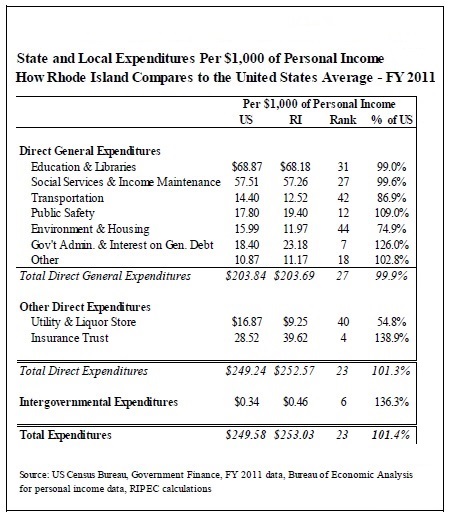 Those findings are based on an annual report issued by the Rhode Island Public Expenditure Council, which uses the latest available U.S. Census data—in this case, fiscal year 2011—to assess how local and state government spend money.