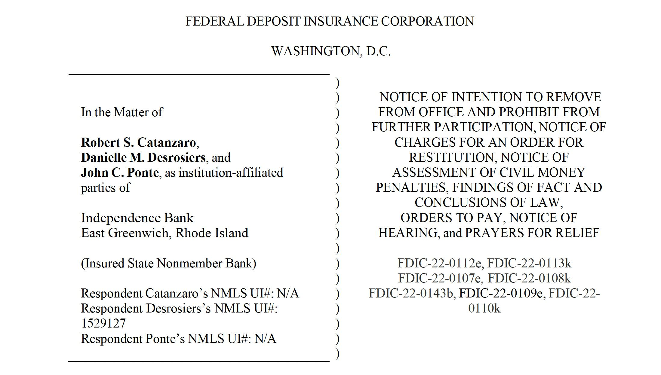 Robert S. Catanzaro and Danielle Desrosiers — top executives with Independence Bank in East Greenwich — and finance professional John Ponte are facing nearly a million dollars in restitution and penalties by the FDIC.