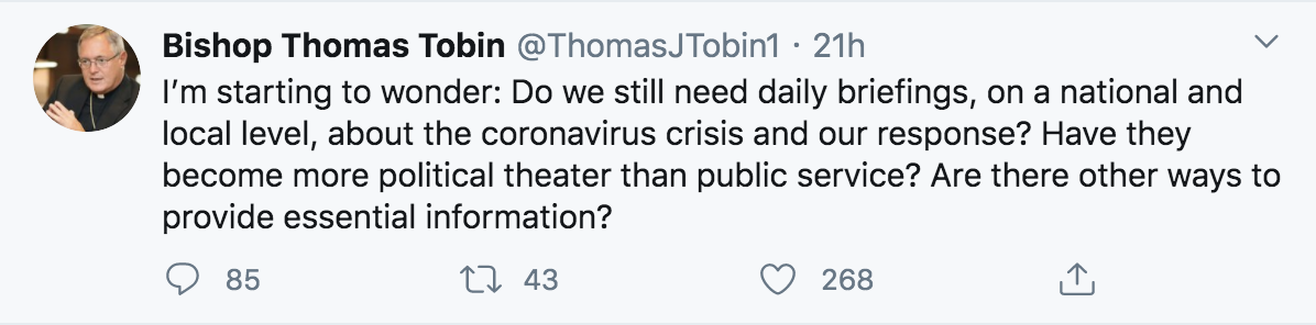 In March, Tobin announced that he was suspending the celebration of all public masses and other liturgical services in the Diocese of Providence until further notice due to the threat of the outbreak of coronavirus.