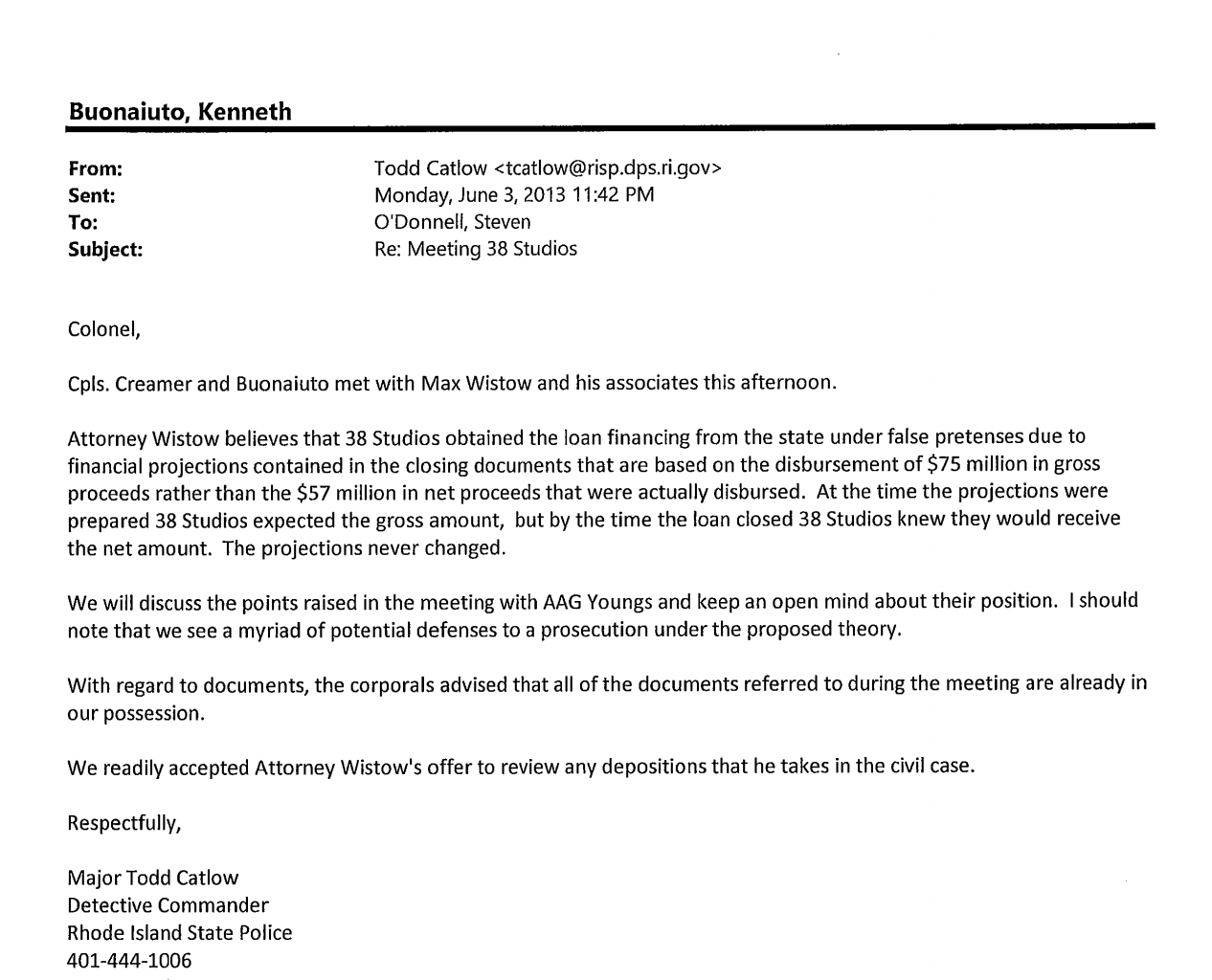 In an email from then-Major Todd Catlow to then-Colonel O’Donnell, Catlow wrote, “Attorney Wistow believes 38 Studios obtained the loan financing from the state under false pretenses due to financial projections in the closing documents that are based on the distribution of $75 million in gross rather than the $57 million in net proceeds that were actually disbursed. At the time of the projections were prepared 38 studios expected the gross amount, by the time the loan closed 38 Studios knew they would receive the net amount. The projections never changed.”