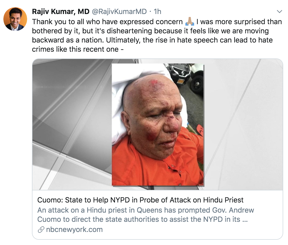 On Wednesday, Kumar -- who says on his Twitter page that "opinions are his own" took to Twitter again to decry racism in America, posting an article of brutal an attack on a Hindu priest in New York, and referenced his original Tweet.