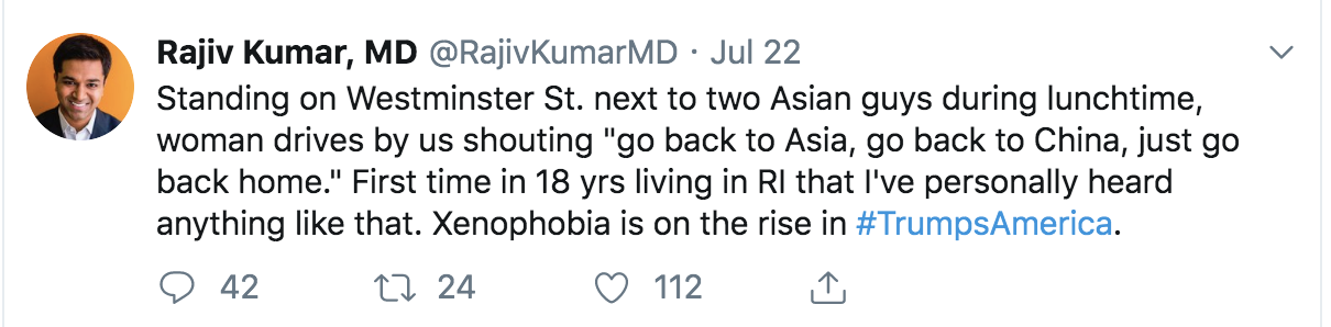 GET THE LATEST BREAKING NEWS HERE -- SIGN UP FOR GOLOCAL FREE DAILY EBLASTStanding on Westminster St. next to two Asian guys during lunchtime, woman drives by us shouting “go back to Asia, go back to China, just go back home.” First time in 18 yrs living in RI that I’ve personally heard anything like that. Xenophobia is on the rise in #TrumpsAmerica