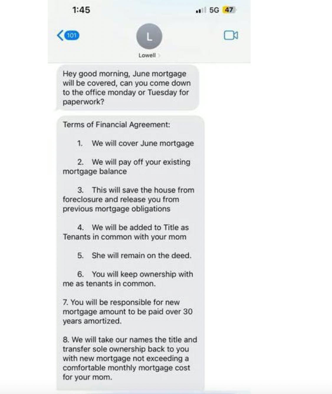 • “We will take our names the title and transfer sole ownership back to you with new mortgage not exceeding a comfortable monthly mortgage cost for your mom.”