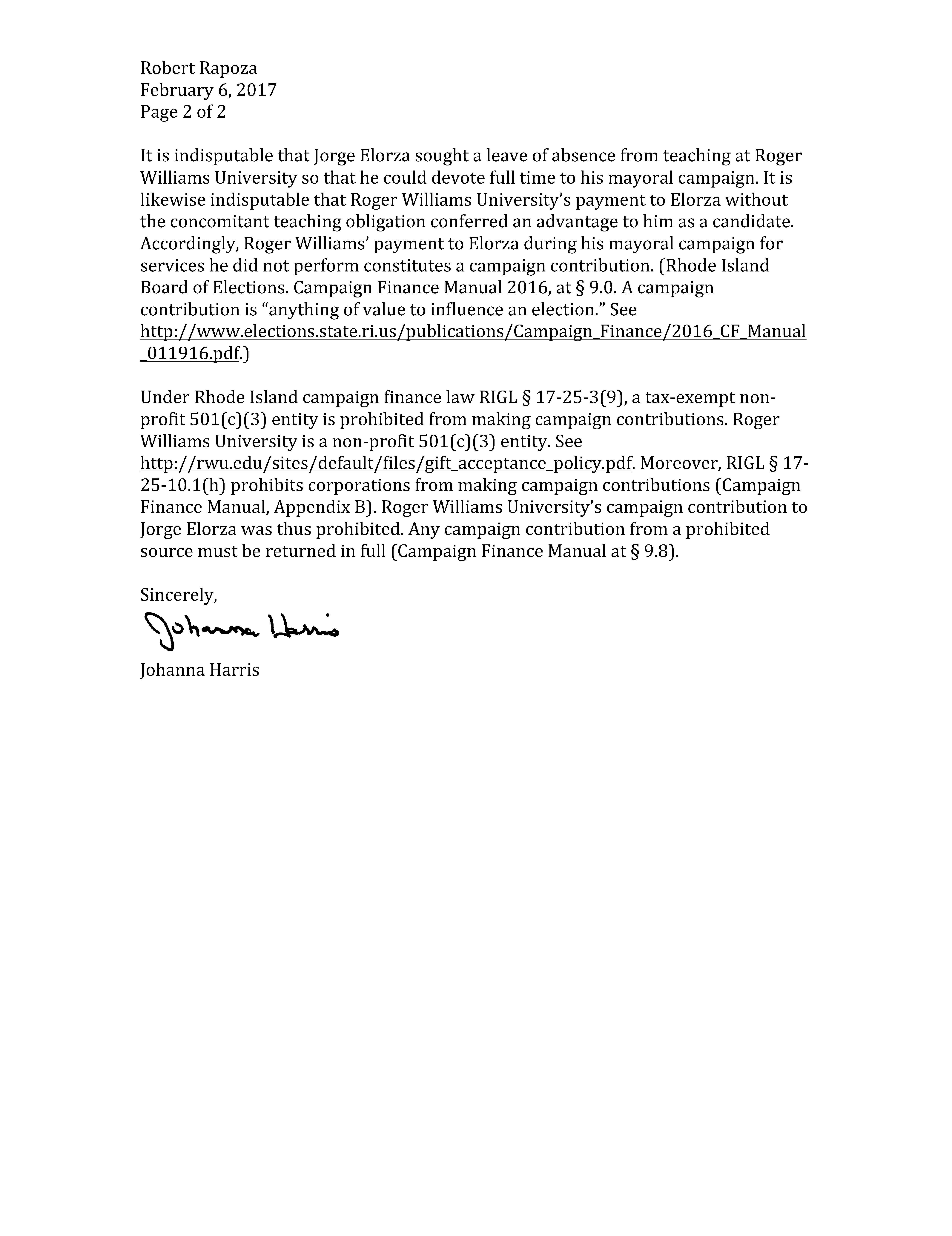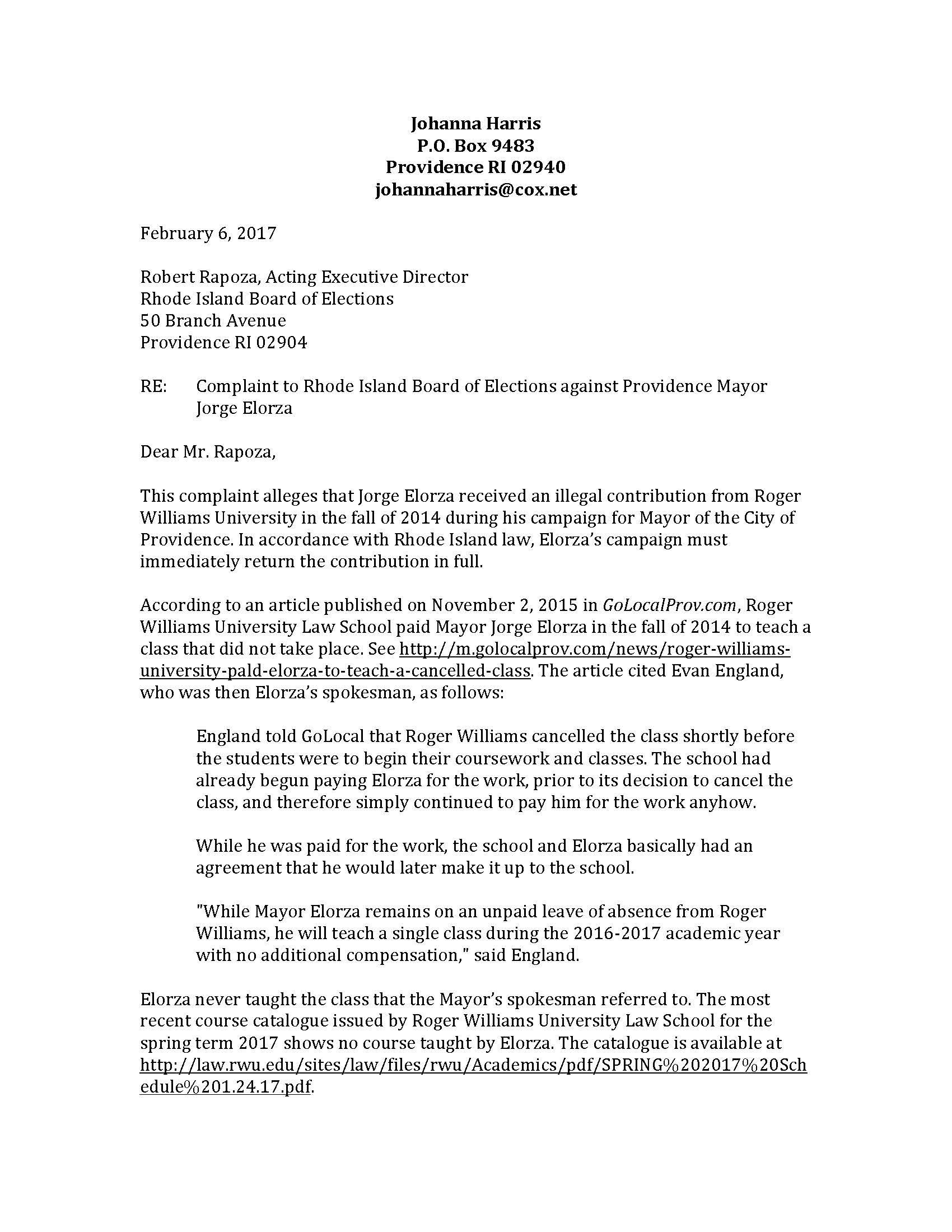 “This complaint alleges that Jorge Elorza received an illegal contribution from Roger Williams University in the fall of 2014, during his campaign for Mayor of the City of Providence. In accordance with Rhode Island law, Elorza’s campaign must immediately return the contribution in full,” writes Johanna Harris in the complaint.