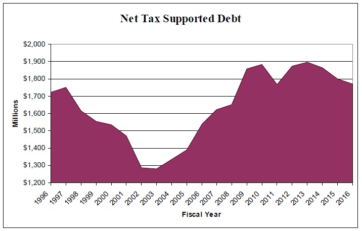 One thing is certain: over the last decade tax-supported debt has increased by roughly half a billion dollars, state records show. (See chart at right.)