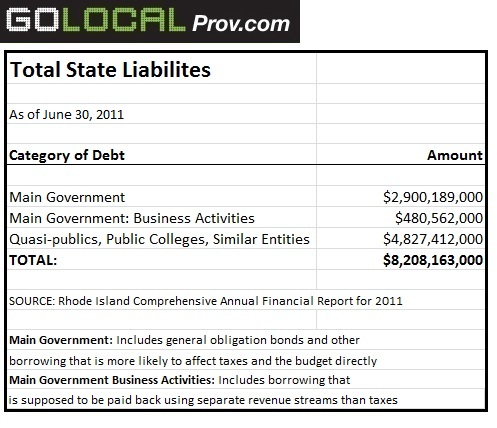 The total figure incorporates all of the debt associated with the operations of state government, which totals $2.9 billion. The lion’s share of the remainder, about $4.8 billion, is debt incurred by the many quasi-public agencies affiliated with the state, including RIPTA, the Economic Development Corporation, the state landfill, the Rhode Island Turnpike and Bridge Authority, and state colleges and universities.
