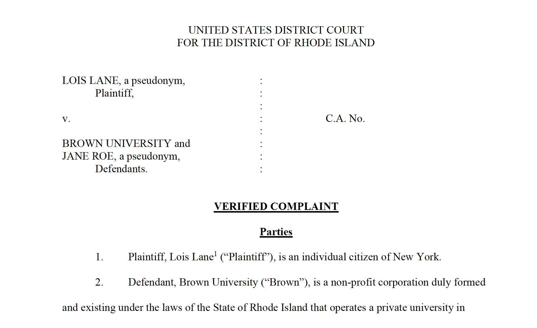 Lane’s suit states, “Title IX prohibits Brown from discriminating against Plaintiff based on sex, including on the basis of being a transgender female, in connection with any educational program or activity" and that "plaintiff has been the victim of severe, pervasive, and objectively offensive sexual harassment and gender-based discrimination by Jane Roe, a school peer. The gender-based discrimination and harassment has caused Plaintiff to be deprived of educational opportunities and benefits.”