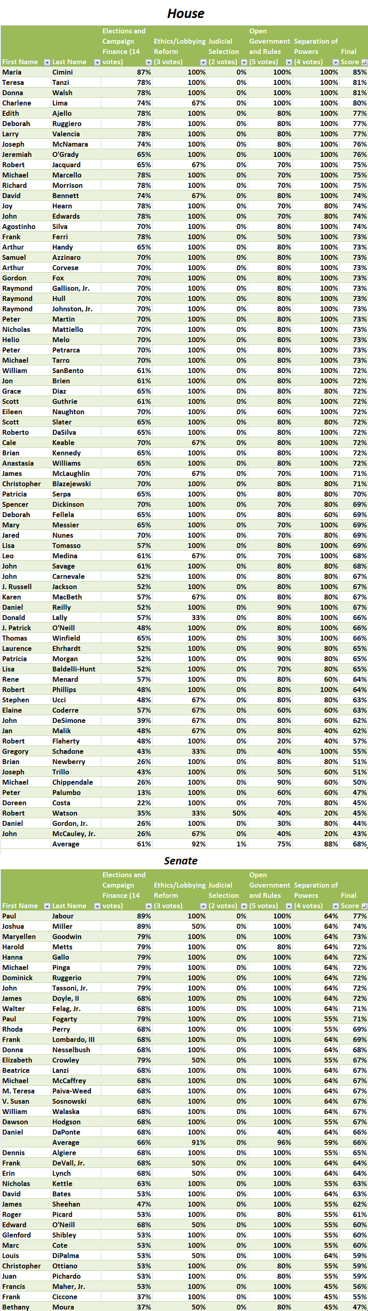 “The nuances of the legislative process are not what it seems on its face,” Blais said. “The process of government leads to misleading results and given where we are today the facts may suggest that Rhode Island has a long way to go to achieve truly transparent, clean government. The aggregate score of 68 [and 66] percent would translate into a “D” by traditional academic grading.”