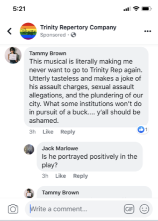 “This musical is literally making me never want to go to Trinity Rep again. Utterly tasteless and makes a joke of his assault charges, sexual assault allegations and the plundering of our city,” wrote Tammy Brown in response to the Trinity Rep post. “What some institutions won’t do in pursuit of a buck…y’all should be ashamed.”