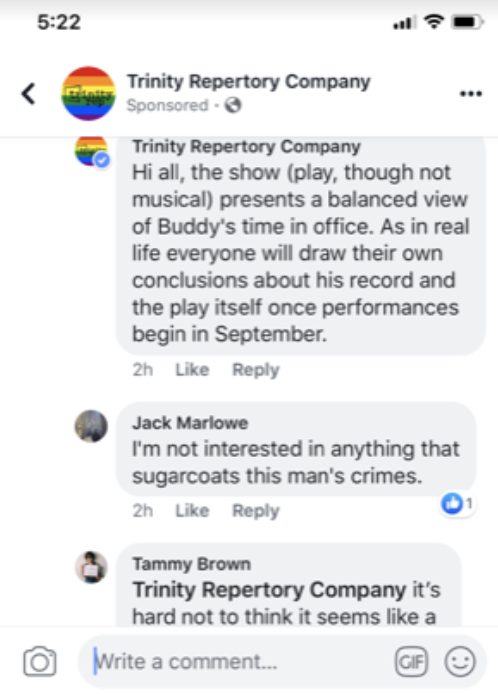 “Hi all, the show (play, though not a musical) presents a balanced view of Buddy’s time in office,” wrote Trinity. “As in real life, everyone will draw their own conclusions about his record and the play itself once performances begin in September.”