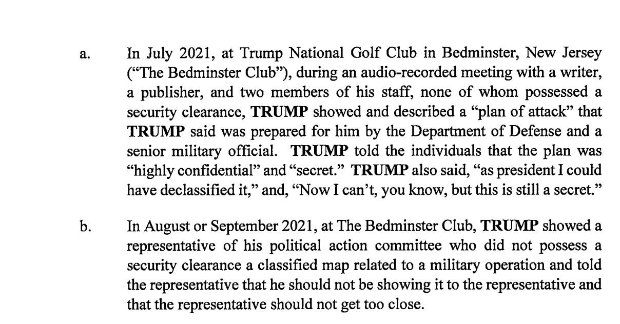 According to the unsealed indictment, “on two occasions in 2021, Trump showed classified documents to others, as follows:”