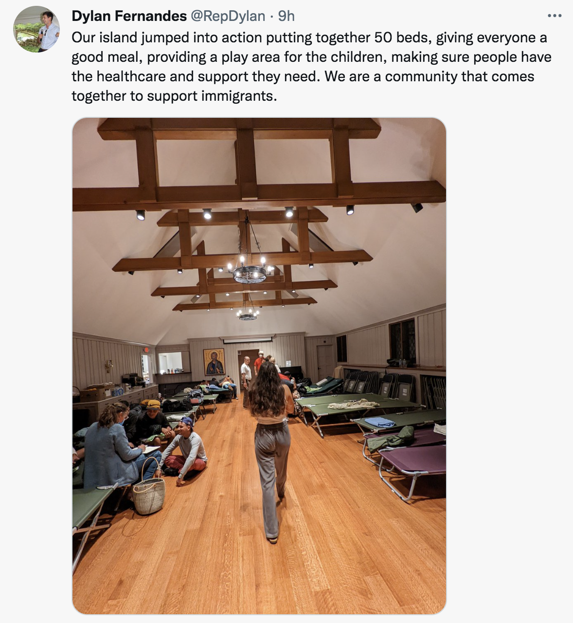 “Currently immigrants are being dropped off on Martha's Vineyard by chartered flights from Texas. Many don't know where they are. They say they were told they would be given housing and jobs. Islanders we're given no notice but are coming together as a community to support them,” Massachusetts State Representative Dylan Fernandes Tweeted on Wednesday.