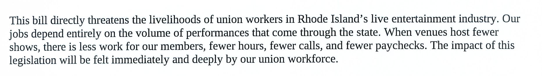 Local IATSE 23, Stagehand Union, warns that the legislation is a job killer. Chris Vilardi, President of the Union writes in a letter to Abney.