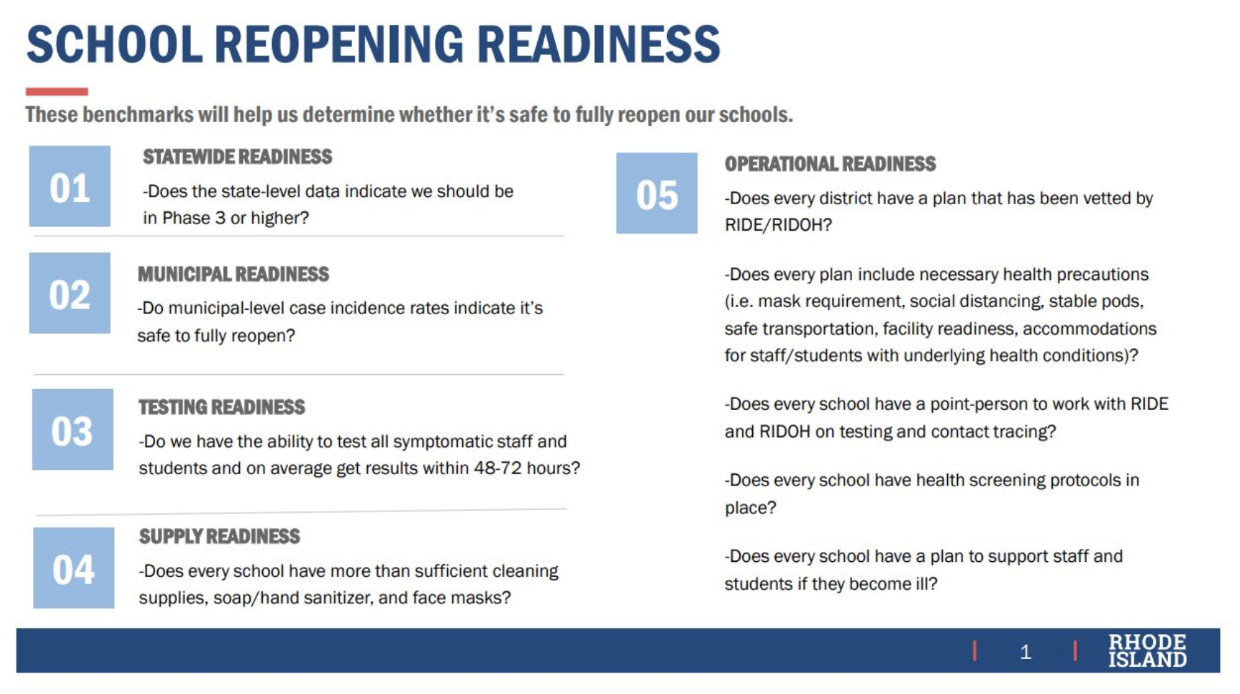 Last week, Rhode Island Governor Gina Raimondo at her weekly coronavirus press conference said the state is “listening to experts” as it thinks about reopening schools, unveiling benchmarks of what will help officials “determine whether it’s safe to fully reopen schools,” including whether there is statewide, municipal, testing, supply, and operational readiness (see metric chart below).