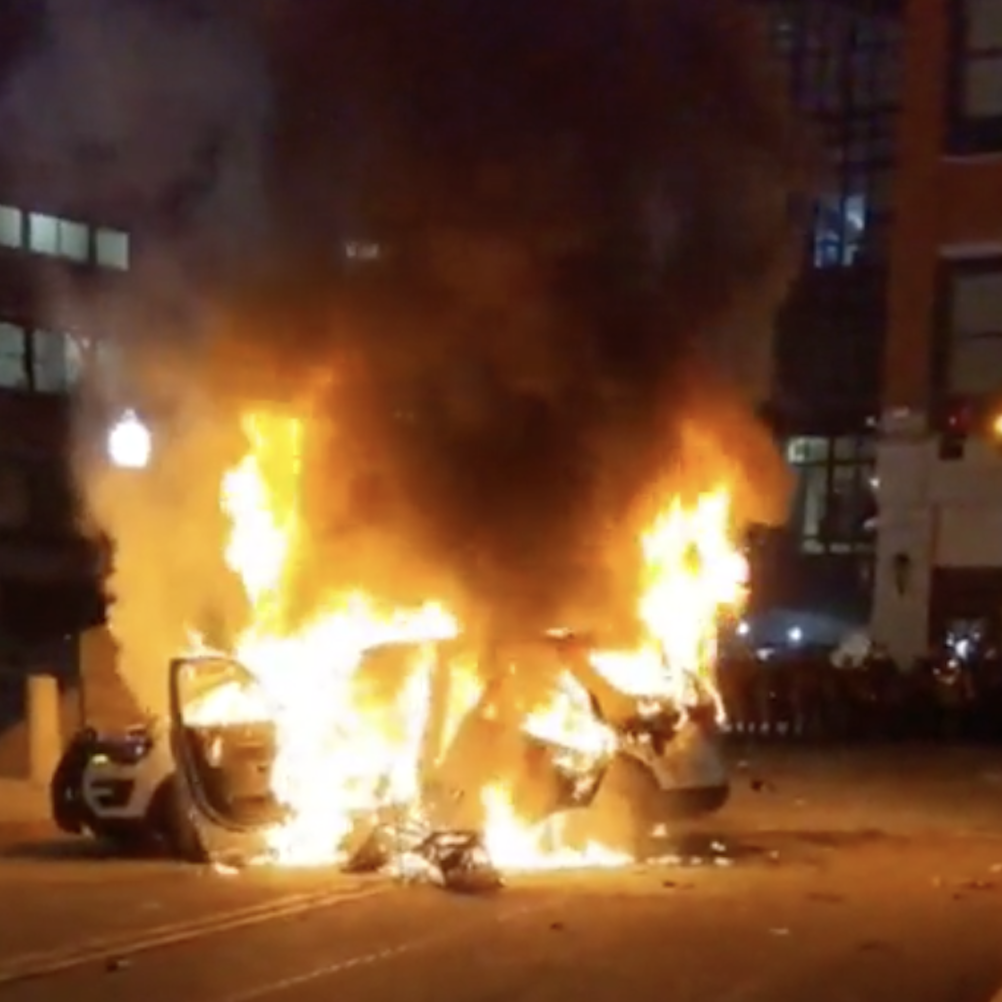 On the night of June 1st, two Providence Police Department officers responded to 1 Providence Place for a riot in progress. The officers parked and secured their vehicle but were overtaken by a group of individuals throwing rocks, bottles, and other objects. Shortly thereafter, several individuals vandalized the cruiser, breaking its windows, and eventually setting it on fire.