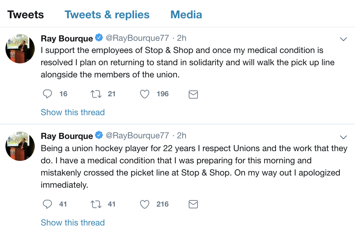 "Being a union hockey player for 22 years I respect Unions and the work that they do. I have a medical condition that I was preparing for this morning and mistakenly crossed the picket line at Stop & Shop. On my way out I apologized immediately," Tweeted Bourque. "I support the employees of Stop & Shop and once my medical condition is resolved I plan on returning to stand in solidarity and will walk the pick up line alongside the members of the union."