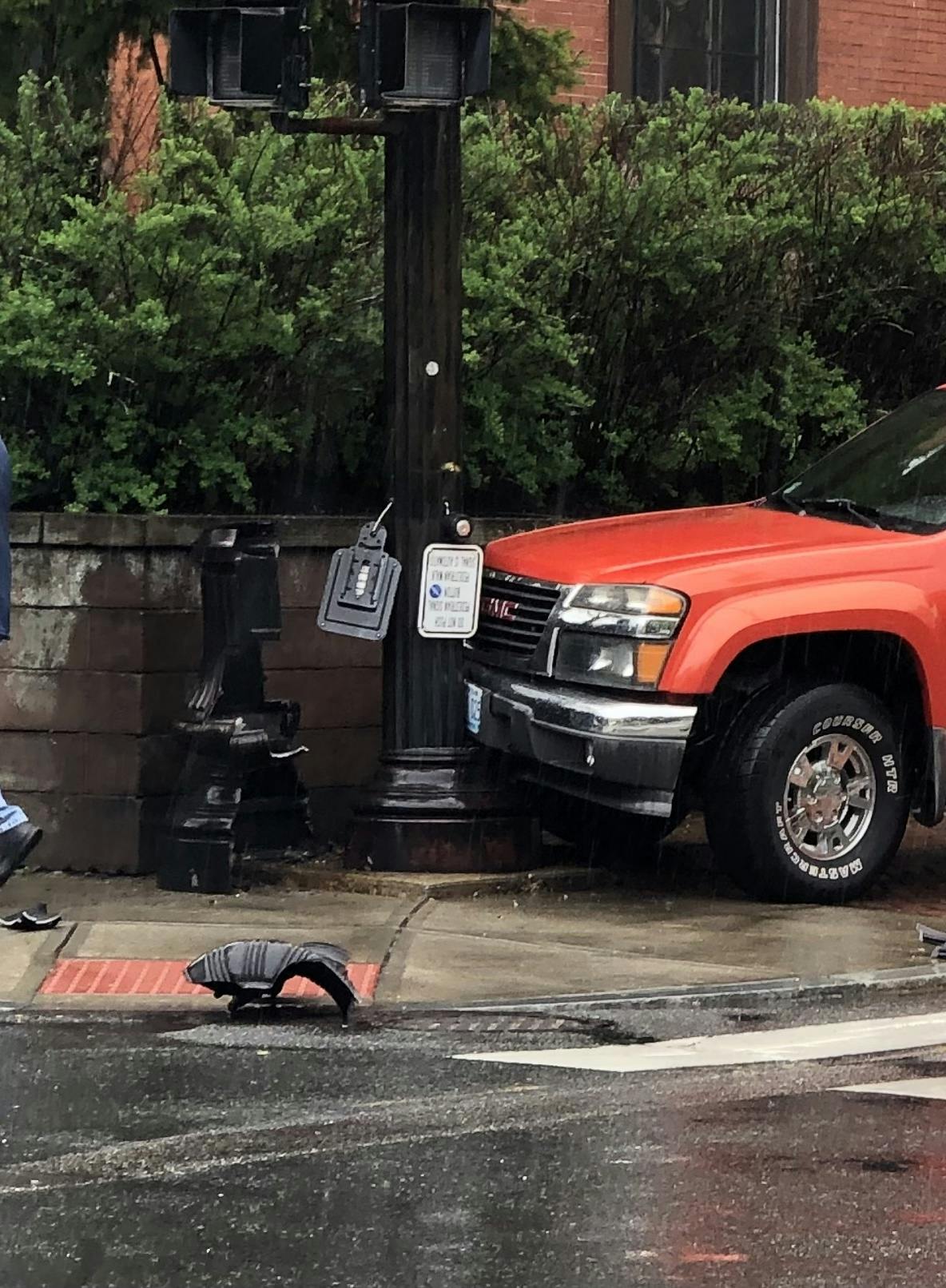 After spinning around, he drove forward the wrong way on Waterman and took out a traffic light support before coming to a stop.