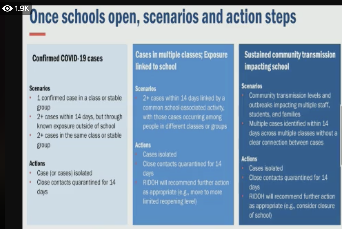 Raimondo outlined three scenarios in which the Rhode Island Department of Health would respond to — and assess — varying levels of cases emerging in schools