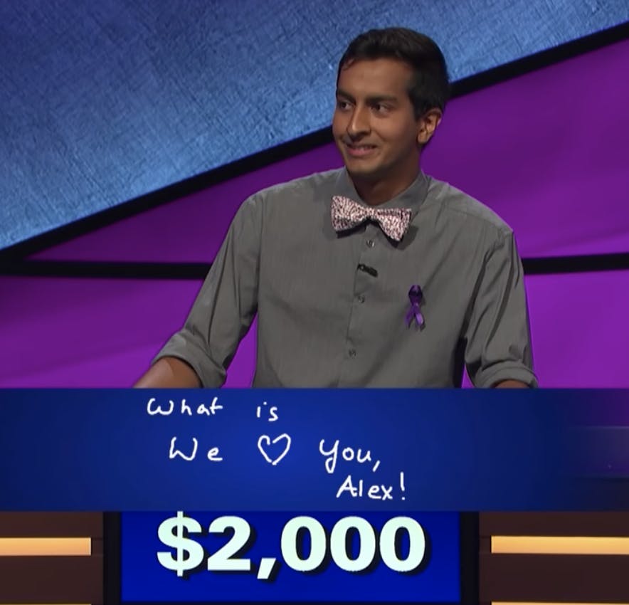 Host Alex Trebek, who has been battling cancer, read Guar's answer out loud -- and was met with a personal message of support.