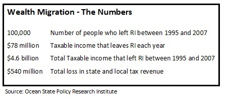 A total of 100,000 people, or approximately 1 out of every 10 residents, made their exit between 1995 and 2007, according to data from the study obtained by GoLocalProv. As a result, the state has also seen about $78 million in annual tax revenue go away. (The $4.6 billion figure is the cumulative total of the wealth that has left the state.)