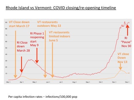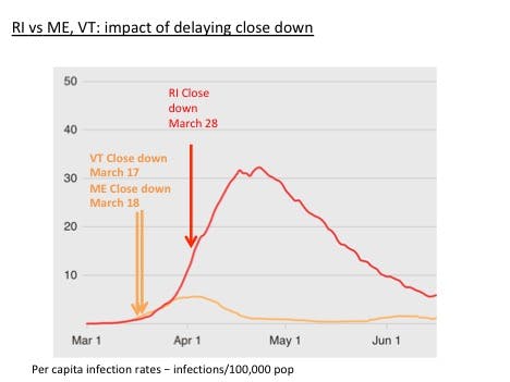 Rhode Island’s delays in taking action allowed infection rates to get much higher here than in Vermont and Maine.