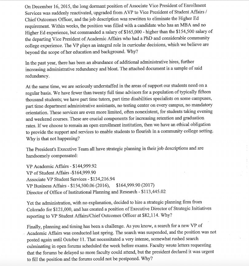 Finally, during the past year the Council has approved myriad administrative hires while support services for students are understaffed with a large percentage of part time employees. In our view, robust student support is what we need to improve retention and graduation rates, not more administrators and assistants.