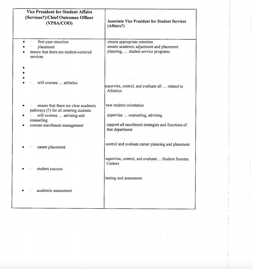 While the Council requires that faculty hold a Master's in their field, limits the faculty to teaching in that specific discipline, and requires thirty additional credits for promotion to Associate Professor, the Council has approved the hiring of a Vice President of Student Affairs/Chief Outcomes Officer who holds an MBA, yet makes college wide curricular decisions.