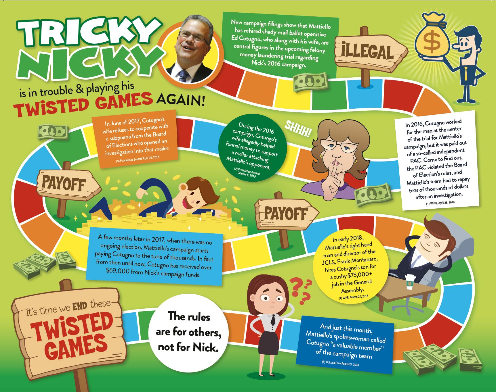 The battle between Rhode Island House Speaker Nicholas Mattiello, a Democrat, and Republican Barbara Ann Fenton-Fung for the House seat in Cranston now held by the speaker continues to be the most entertaining political fight in the state. Consider the ever-ingenious Ms. Fenton-Fung’s Candyland-like game board showing some of Mr. Mattiello’s alleged misdeeds!