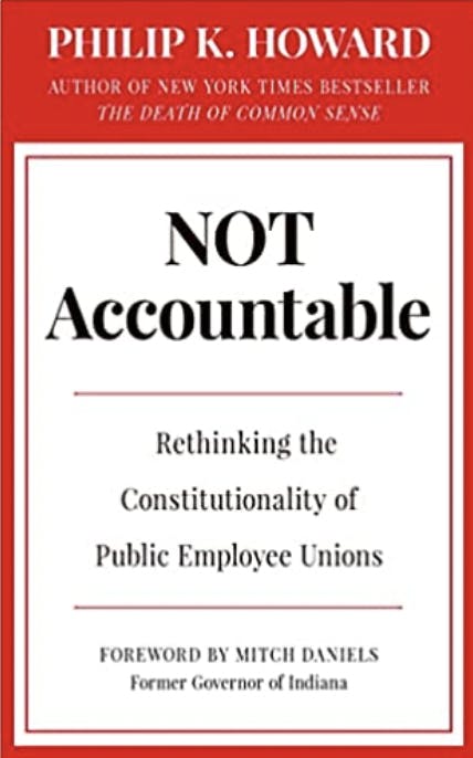 A few weeks ago, I noted that Philip K. Howard’s new book, Not Accountable: Rethinking the Constitutionality of Public Employee Unions, was about to be published and would get a lot of attention. I encourage citizens to read this important – and very readable -- work. Indeed, it’s often entertaining in a mordant way. (I heard Mr. Howard speak the other week in New York.)